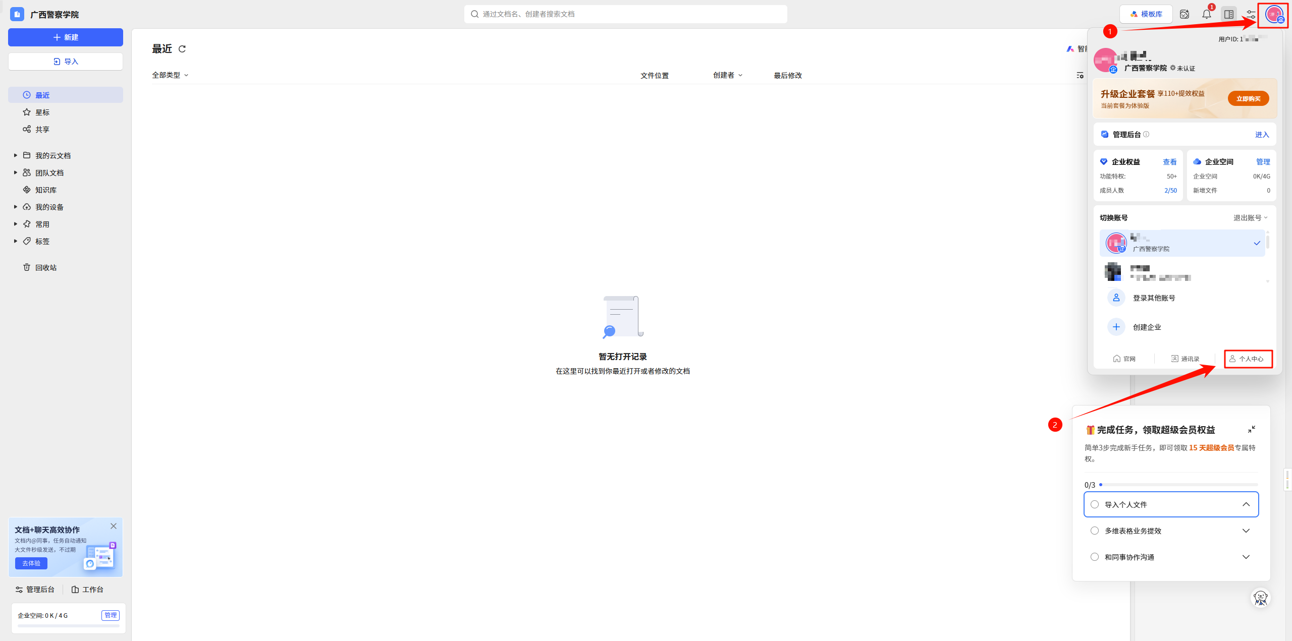 5.将鼠标放到右上角用户头像上然后点击右下方的“个人中心”